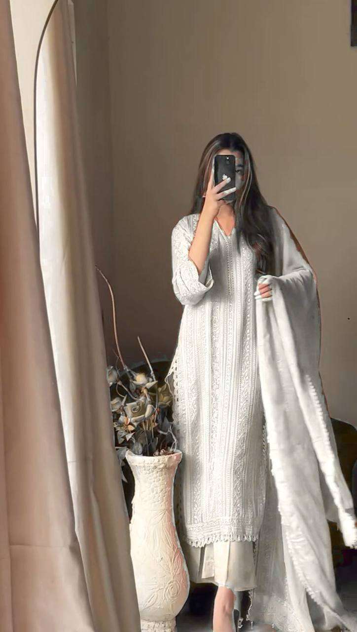 Women’s Chinon Silk with Cotton Thread Embroidery Straight Kurti With Pant and Dupatta set